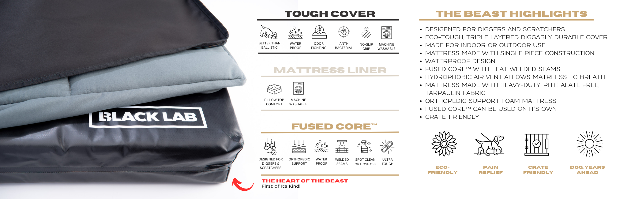 Introducing our Fused Core™ Mattress, the first of its kind. Single-piece construction, this ultra-durable marvel offers unmatched orthopedic support for your pup. Unlike traditional mattresses, it's heavy-duty fabric and fused seams are designed to withstand water, slobber, drool, accidents, and more. Keeping all moisture away from the foam inside. Worry-free comfort guaranteed. Included pillow top mattress cover ads cloud-like comfort.